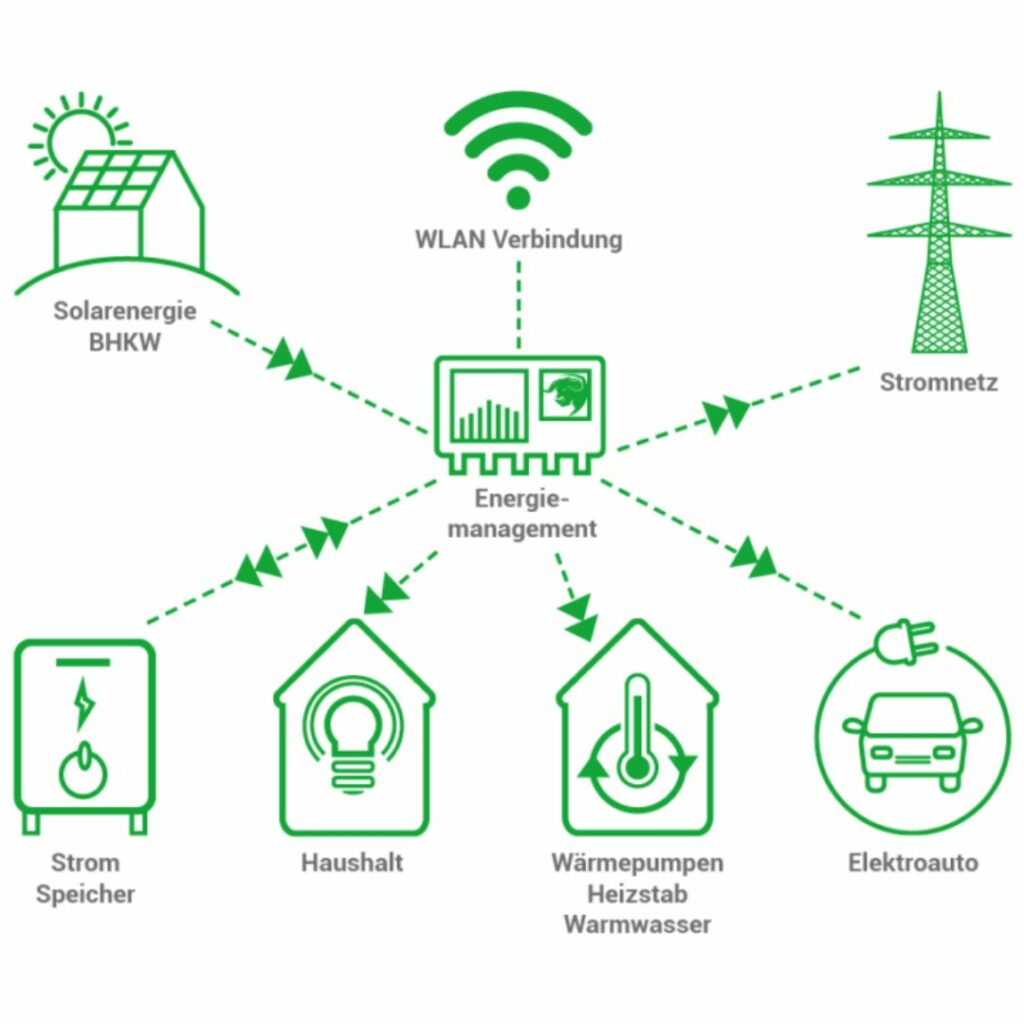 Wenn Sie Solarenergie nutzen, können Sie mit unserem Energiemanagementsystem den erzeugten Strom in verschiedene Leitungen führen. So ist es zum Beispiel möglich, dass der erzeugte Strom nach Bedarf auch in den Ladevorgang Ihres Fahrzeugs integriert werden kann. Genauso kann dieser Strom auch für Ihren Haushalt, Ihre Wärmepumpe oder auch in Ihren Stromspeicher oder ins Stromnetz eingespeist werden.